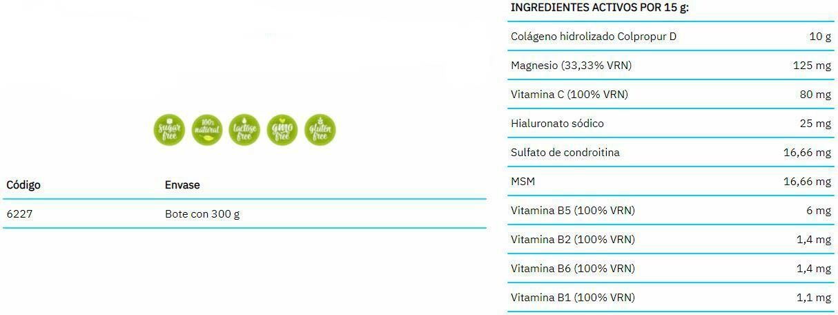 Colageno hidrolizado Colpropur D, Maltodextrina, Citrato de Magnesio, Aroma de Fresa, Vitamina C (L-Ascórbico), Hialuronato sódico, edulcorante (sucralosa) Sulfato de Condroitina, MSM (Metilsulfonilmetano), Vitamina B5 (Pantetonato de calcio), Vitamina B2 (Riboflavina), Vitamina B6 (Piridoxina Clorhidrato), Vitamina B1 (Tiamina Clorhidrato).
