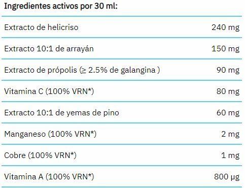 Agua, azúcar moreno, extractos hidroalcohólicos de erísimo y helicriso, extracto seco de arrayán, extracto hidroalcohólico de própolis, ácido l-ascórbico (vitamina C), acidulante (ácido cítrico), conservante (sorbato potásico), extracto seco de yemas de pino y gordolobo, manganeso gluconato, aceite esencial de pino, espesante (goma xantana), cobre gluconato, aceites esenciales de hinojo, limón y menta, acetato de retinilo (vitamina A).