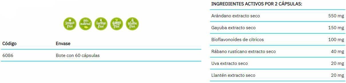 Extracto seco de arándano, extracto seco de Gayuba, Bioflavoniodes de cítricos, extracto seco de Rábano rusticano, extracto seco de Uva, extracto seco de Llantén, excipientes (estearato de magnesio, almidón de maíz). Cobertura: cápsula de gelatina, colorante (E-171).