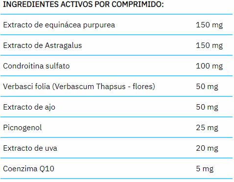 Extracto de Equinácea purpurea, extracto de Astragalus, Verbasci folia, extracto de Ajo, Picnogenol, vitamina C, extracto de Uva, coenzima Q10, celulosa microcristalina, dióxido de Silicio, estearato de magnesio.