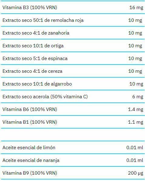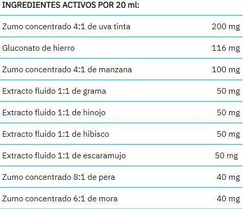 Agua, zumos concentrados de uva roja y manzana, ácido cítrico (acidulante), gluconato de hierro, extractos hidroalcohólicos de escaramujo, grama, hinojo, e hibisco, zumos concentrados de pera y mora, sorbato potásico (conservante), nicotinamida (vitamina B3), extractos de algarrobo, cereza, espinacas, ortiga, remolacha y zanahoria, aceites esenciales de limón y naranja, goma xantana, extracto de acerola, sucralosa, clorhidrato de piridoxina (vitamina B6), clorhidrato de tiamina (vitamina B1) y ácido fólico.