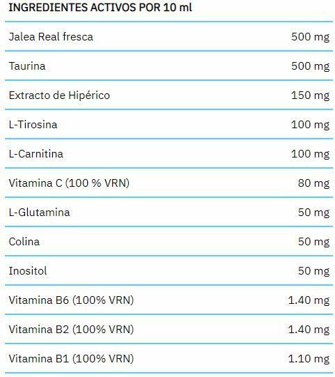 Agua, fructosa, Taurina, Jalea real, extracto fluido de Hipérico, aroma de naranja, L-Tirosina,L-Carnitina, ácido L-ascórbico (vitamina C), L-Glutamina, Colina citrato, Inositol, sorbato potásico (conservador), piridoxina clorhidrato (vitamina B6), riboflavina (vitamina B2), tiamina clorhidrato (vitamina B1).