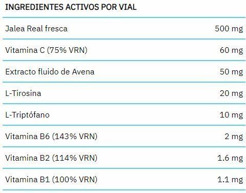 Agua, fructosa, Jalea real, aroma de naranja, ácido L-ascórbico (vitamina C), extracto hidroalcohólico de avena, L-Tirosina, L-Triptófano, conservador (sorbato potásico), piridoxina clorhidrato (vitamina B6), riboflavina (vitamina B2) y tiamina clorhidrato (vitamina B1).