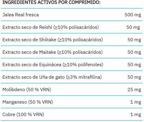 Agua, fructosa, Jalea real, zumo concentrado de Grosellero negro, extracto seco de Uña de gato (Uncaria tormentosa), extracto seco de Echinácea (Echinácea purpurea), Reishi, Shiitake, Maitake, gluconato de Manganeso, gluconato de Cobre, Molibdato de sodio y sorbato potásico (conservador).