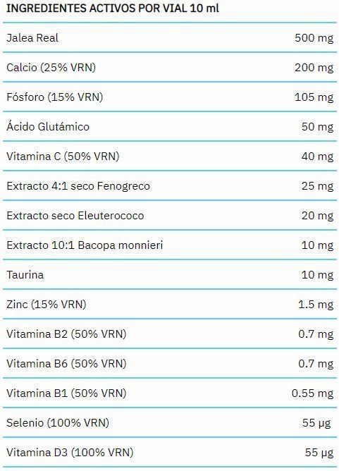 Agua, Jalea Real, Calcio, Fósforo, Ácido L-Glutámico, Ácido L-Ascórbico (Vitamina C), aroma de fresa, extracto seco de Fenogreco, extracto seco de Eleuterococo, extracto seco de Bacopa Monnieri, L-Taurina, sucralosa, Riboflavina (Vitamina B2), Clorhidrato de Piridoxina (Vitamina B6), Clorhidrato de Tiamina (Vitamina B1), selenito sódico y colecalciferol (Vitamina D3).