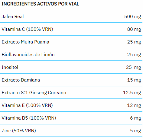 Agua, fructosa, Jalea Real liofilizada, Vitamina C, extracto de Calabaza, gluconato de Zinc, Bioflavonoides de Cítricos, Inositol, extracto de Muira Puama, extracto de Damiana, extracto de Ginseng, aroma de Naranja, conservador (sorbato potásico), PABA, Vitamina E, Vitamina B5, Vitamina B6, Vitamina B2, Vitamina B1, Vitamina A, Yoduro potásico, picolinato de Cromo, Selenito Sódico, Vitamina K, D-Biotina, Vitamina D3, Vitamina B12.