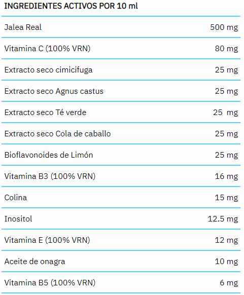 Agua, fructosa, Jalea Real liofilizada, gluconato de Hierro, Vitamina C, gluconato de Magnesio, gluconato de Zinc, extracto de Cimicifuga, extracto de Agnus Castus, extracto de Té verde, extracto de Cola de caballo, bioflavonoides de cítricos, gluconato de Manganeso, aroma de naranja, conservador (sorbato potásico), vitamina B3, Colina, Inositol, Vitamina E, gluconato de Cobre, Vitamina B5, Vitamina B6, Vitamina B2, Vitamina B1, Vitamina A, yoduro potásico, picolinato de Cromo, Selenito sódico, Vitamina K, D-Biotina, Vitamina D3, Vitamina B12.