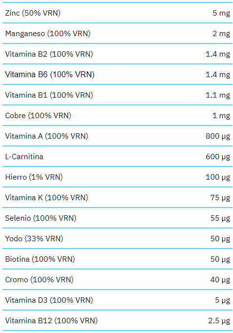 No superar la dosis diaria expresamente recomendada. Los complementos alimenticios no deben utilizarse como sustitutos de una dieta equilibrada. Conservar en lugar fresco y seco, fuera de alcance de los niños más pequeños.