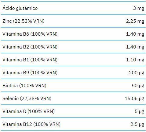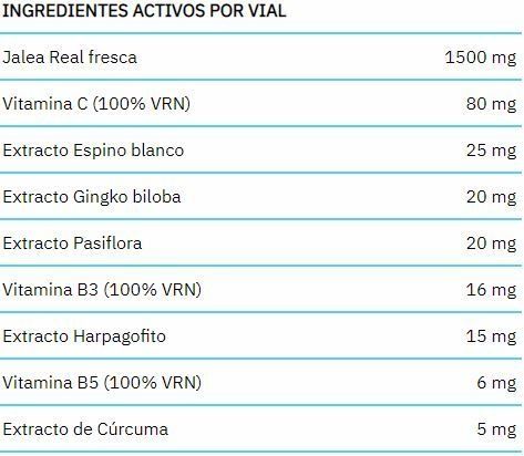 Agua, fructosa, Jalea real liofilizada, Ácido L-ascórbico (Vitamina C), acidulante (ácido cítrico),aroma de naranja, extractos de Ginkgo biloba y Pasiflora, conservador (sorbato potásico), Nicotinamida (Vitamina B3), Zinc gluconato, extracto de Harpagofito, Dpantotenato cálcico (Vitamina B5), extracto de Cúrcuma, Ácido L-glutámico, extracto de Espino blanco, Clorhidrato de piridoxina (Vitamina B6), Riboflavina (Vitamina B2), Clorhidrato de tiamina (Vitamina B1), Ácido pteroilmonoglutámico (Vitamina B9), D-Biotina, Selenito sódico, Colecalciferol (Vitamina D), Cianocobalamina (Vitamina B12).