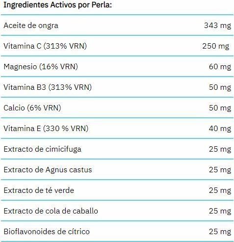 Aceite de onagra, vitamina C, magnesio, vitamina B3, calcio, vitamina E, extracto de cimicifuga, extracto de Agnus castus, extracto de té verde, extracto de cola de caballo, bioflavonoides (cítricos), vitamina B5, colina, hierro, inositol, vitamina B2, vitamina B6, zinc, vitamina B1, manganeso, cobre, vitamina A, vitamina B11, vitamina K, biotina, selenio, yodo, cromo, molibdeno, vitamina B12, y vitamina D3.