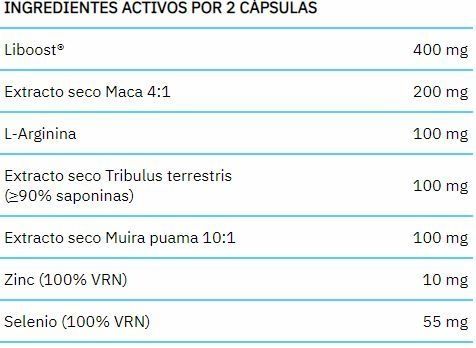 Liboost® (Turnera diffusa), extracto seco de maca, L-arginina, extractos secos de Tribulus terrestris y Muira puama, gluconato de zinc, L-seleniometioninina, antiaglomerante