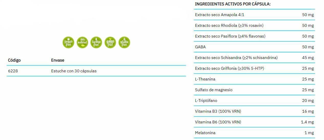 Extracto de Amapola, extracto de Rhodiola, extracto de Pasiflora, GABA, extracto de Shisandra, almidón de maíz, extracto de Griffonia, L-Theanina, sulfato de magnesio, L-Triptófano, antiaglomerante (estearato de magnesio), nicotinamida (Vitamina B3), clorhidrato de piridoxina (Vitamina B6), Melatonina. Cobertura: cápsula de gelatina.