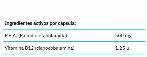 P.E.A. (Palmitoiletanolamida), almidón de maíz, cianocobalamina (vitamina B12). Cobertura: Cápsula de gelatina transparente.