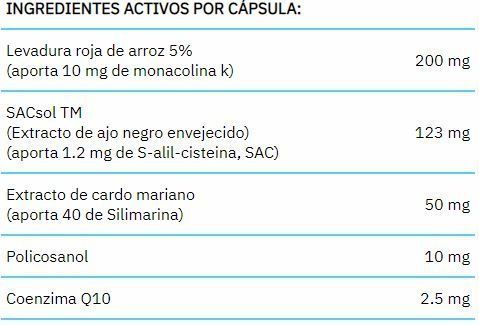 Levadura roja de arroz (Monascus purpureus), SACsol™ (extracto de ajo negro envejecido), antiaglomerante (almidón de maíz y estearato de magnesio), extracto seco cardo mariano, policosanol, coenzima Q10. Cobertura: cápsula de gelatina transparente.