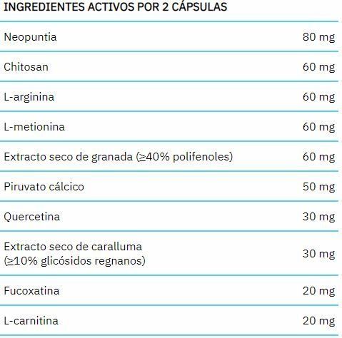 Almidón de maíz, Neopuntia® (extracto de Opuntia ficus-indica), chitosán (CRUSTÁCEOS), extracto concentrado de granada, L-arginina, L-metionina, piruvato cálcico, extracto concentrado